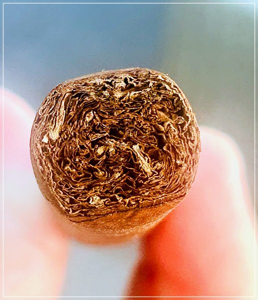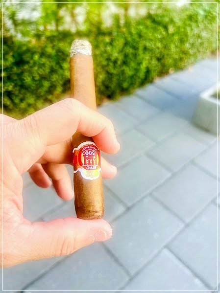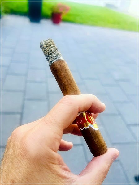 Visualmente, el cigarro presenta una capa de tono colorado claro a medio, con textura algo rústica, venas visibles pero no groseras y un armado general uniforme. No es un puro lujoso en su apariencia ni pretende serlo; transmite más bien seriedad artesanal y coherencia. El tiro en frío se mostró levemente apretado, aunque funcional, con mucha presencia desde antes del encendido: picante en lengua, madera y especias. El aroma en seco fue de madera y especias dulces, ya insinuando que la liga tenía carácter y no iba a entregarse de forma blanda.
