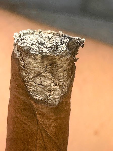 La quema fue lenta durante toda la fumada. El tiro pasó de ajustado a francamente extenuante en varios momentos, aunque con mejoras parciales tras sacudir la ceniza o reactivar la brasa. La línea de quema fue irregular durante gran parte del recorrido y requirió retoques ocasionales, con momentos cercanos al tunneling. La ceniza fue constantemente poco atractiva: oscura, dispersa y quebradiza.
