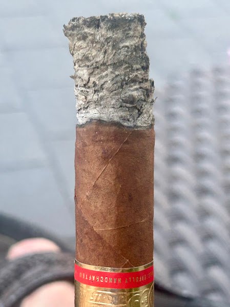 El último tercio mantiene la estabilidad aromática con pimienta roja elegante, café, madera más profunda cercana al roble y chocolate dulce moderado. El humo se mantiene abundante y la textura del cigarro se vuelve más cremosa y redonda.