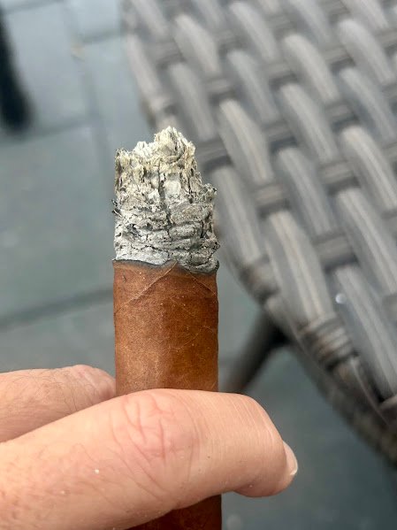 Tras un encendido inicial algo irregular, la combustión se estabiliza y la línea de quema se mantiene mayormente pareja. La ceniza gris oscuro resulta firme y bien adherida durante buena parte de la fumada.